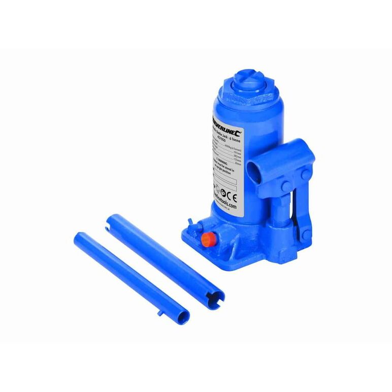Stabile Ganzstahlkonstruktion, Schnellmontagehebel und Überlast-Sicherheitsventil. Dieser strapazierfähige, hydraulische Flaschenwagenheber ist dank seines großen Standfußes robust und kippsicher und ist mit einer Schraube zur Höhenverstellung ausgestattet. Entspricht der Norm EN 1494/A1:2008.