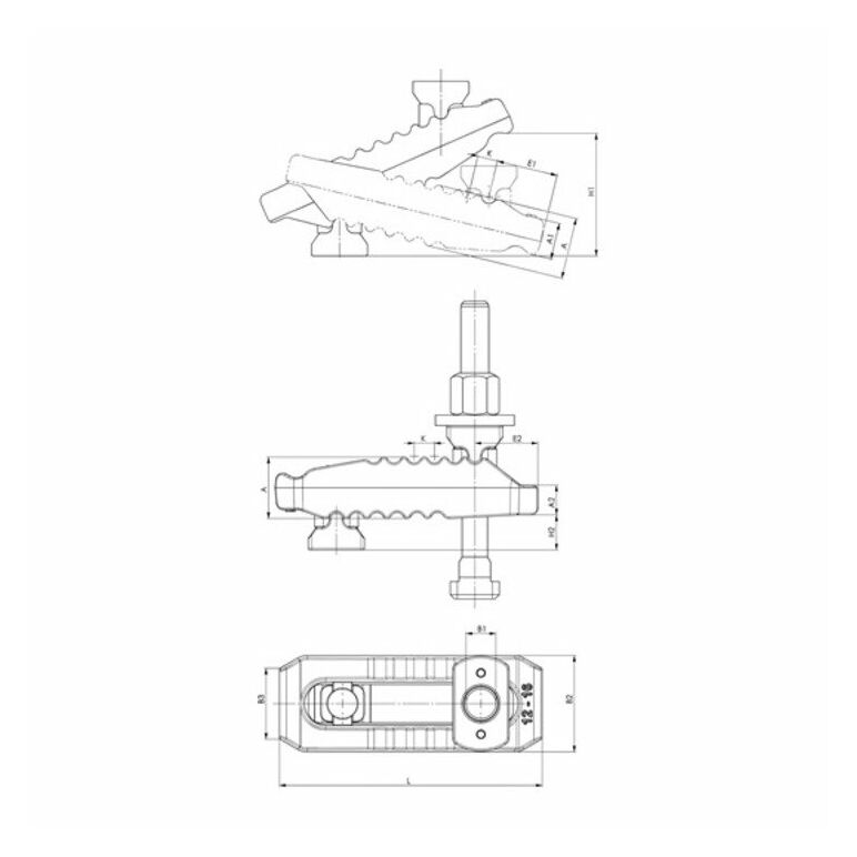 mit Gegenhalter · verstellbar · kompl. mit Spannschraube DIN 787, Scheibe DIN 6340 und Mutter DIN 6330B · stufenlos verstellbar, vergütet, verzinkt mit unverlierbarem Druckstück und Gegenlager · Anwendung: Das Krokodil wird bei allen Spannaufgaben, bei denen über T-Nuten und Gewindebohrungen gespannt wird, eingesetzt. Das Druckstück und der Gegenhalter sind unverlierbar mit der Spannpratze verbunden, somit ist das Krokodil schnell einsatzbereit. Die Spannpratze ist mit zwei Spannnasen ausgestattet und kann je nach Einsatzfall einfach umgedreht werden. Dadurch werden alle Einsatzgebiete, bei der spanabhebenden und spanlosen Bearbeitung (z.B. Spritzgießen und Pressen) abgedeckt. Weitere technische Eigenschaften: · Länge: 187 mm · A: 42mm · B1: 21mm · B2: 62mm · E2: 44mm · E1: 44mm · Gewicht: 3018g · A2: 20mm · H1: 0-80mm · H2: 30mm · L: 187mm · A1: 27mm · K: 14mm · B3: 30mm