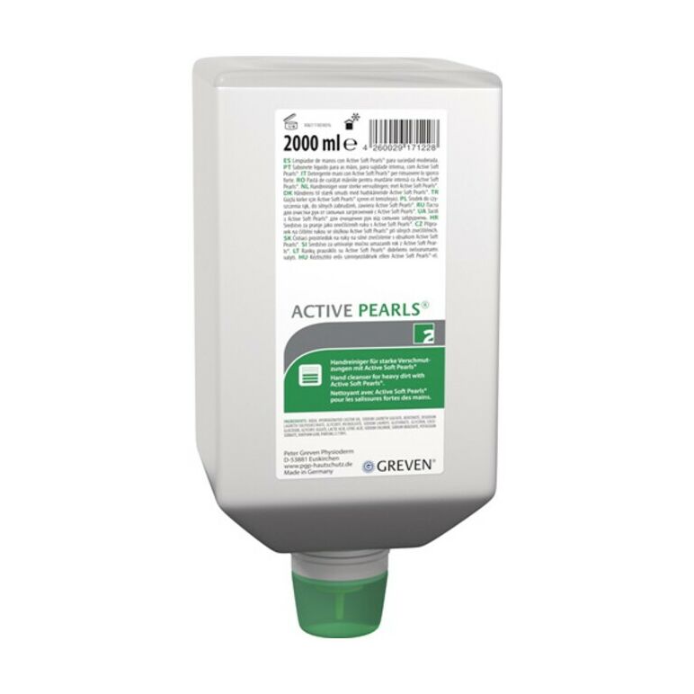 GREVEN® ACTIVE PEARLS® ist ein Handreiniger für starke Verschmutzungen, der hervorragende Reinigungswirkung erzielt, ohne die Haut durch abrasive Reibekörper zu belasten · dank der neuartigen und patentierten Schmutzlösekörper Active Soft Pearls® (ASP) wirkt GREVEN® ACTIVE PEARLS® hocheffektiv auch gegen hartnäckigen Schmutz – und schont dabei die Haut · mit einer sehr wirksamen und milden Tensidmischung aus Acylglutamat sowie mit rückfettenden Glycerinester · Anwendung: auf die trockenen Hände verteilen, Hände mit wenig Wasser waschen, gründlich abspülen und trocknen Weitere technische Eigenschaften: · Ausführung: hautschonend · Eigenschaft: Tensidmischung · Gebinde: Flasche · Reinigungsbereich: starke Verschmutzung · passend für: 9000 473 404