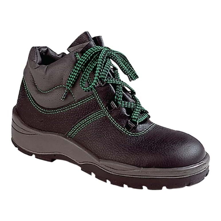 nach DIN EN ISO 20345:2011 · S3 SRA · Obermaterial: Schaft aus schwarz/grauem Rindnarbenleder, wasserabweisend · grüne Kontrastnähte · Knöchel-, Schaftrand- und Laschenpolster · Stahlkappe · Stahlzwischensohle · Innensohle durchgehend und ergonomisch geformt · rutschhemmende 2-Schichten-PUR-Laufsohle · antistatisch · öl- und säurebeständig · Weite 10 Weitere technische Eigenschaften: · Zehenschutzkappe: Stahl · Zwischensohle: Stahl · Norm: EN ISO 20345