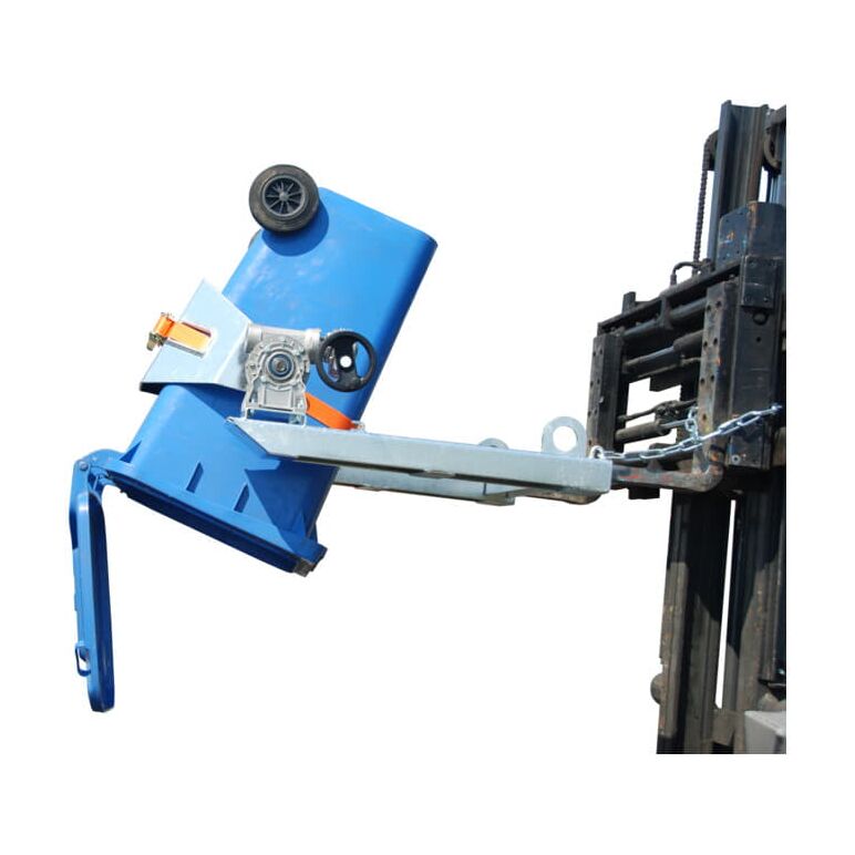 Transportieren, dosiertes Kippen, Wenden und Ablegen von Stahl-Spundfässern, Stahl-Deckelfässern, Rollreifenfässern, Kunststoff-L-Ringfässern und Kunststoff-Doppel-L-Ringfässern von 60 bis 220 Liter Inhalt sowie für 120/240-l-Müllbehälter