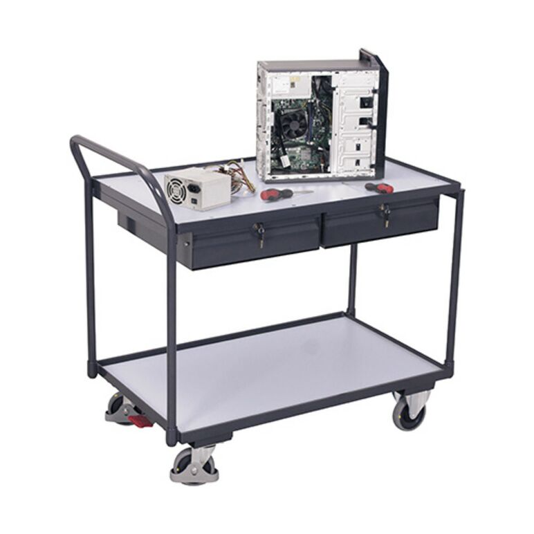 VARIOfit ESD Tischwagen mit 2 Ladeflächen und 2 Schubladen Schiebegriff nach oben gerichtet