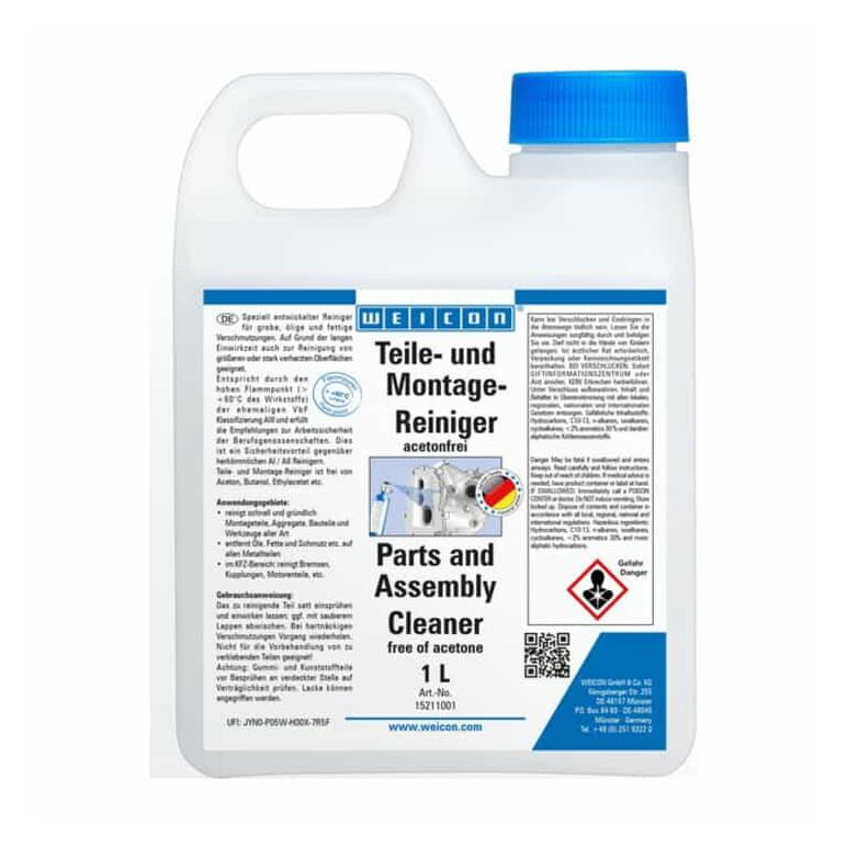 WEICON Teile- und Montagereiniger ist ein speziell entwickelter Reiniger mit hohem Flammpunkt (>+60°C/140°F) des Wirkstoffs und langer Einwirkzeit zur Beseitigung grober, öliger, verharzter und fettiger Verschmutzungen. Teile- und Montagereiniger entspricht durch den hohen Flammpunkt der ehemaligen VbF Klassifizierung AIII und erfüllt die Empfehlungen zur Arbeitssicherheit der Berufsgenossenschaften und ist frei von Aceton, Butanol, Ethylacetat etc. Er reinigt schnell und gründlich Montageteile, Aggregate, Bauteile und Werkzeuge aller Art, entfernt Öle, Fette und Schmutz, etc. auf allen Metallteilen und reinigt Bremsen, Kupplungen, Motorenteile, etc. im KFZ-Bereich.