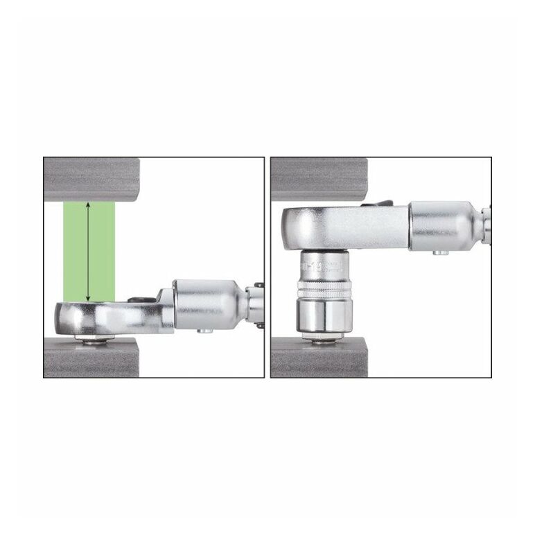 - Besonders flache, tiefgekröpfte Bauform für Arbeiten unter beengten Platzverhältnissen