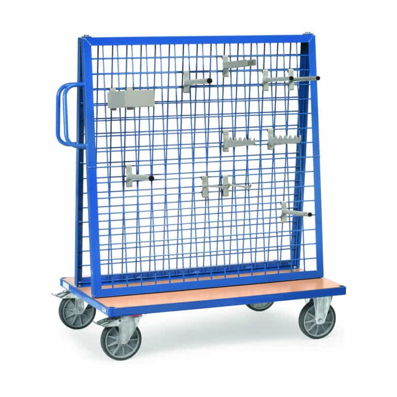 - Feststeller an den Lenkrollen gemäß der Europäischen Norm EN 1757-3 (Sicherheit von Plattformwagen).Sinnvolles Zubehör für Werkstückwagen erhältlich (siehe Zubehör für Werkstattwagen)