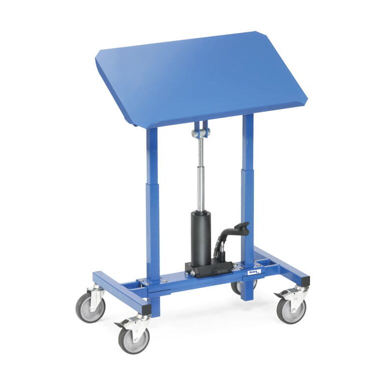 - Plattform mit einseitiger Anlagekante, neigbar um 15° und 30°, stufenlos höhenverstellbar mittels Hydraulikpumpe, auch unter Last möglich