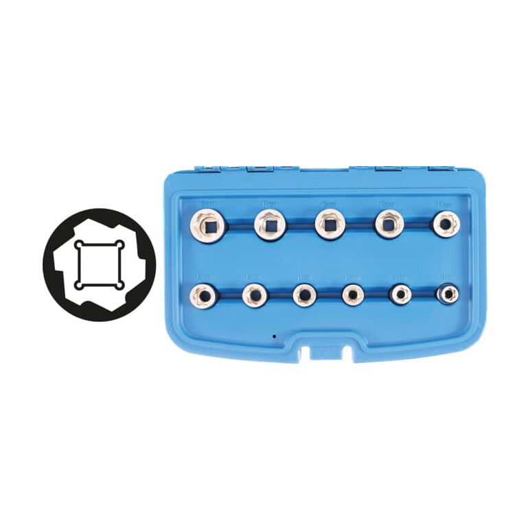 • Spezialeinsätze, zum Lösen festsitzender und rundgedrehter Außensechskantschraubenköpfe und Muttern in 8 - 9 - 10 - 11 - 12 - 13 - 14 - 15 - 16 - 17 - 19 mm (auch zum Anziehen verwendbar)