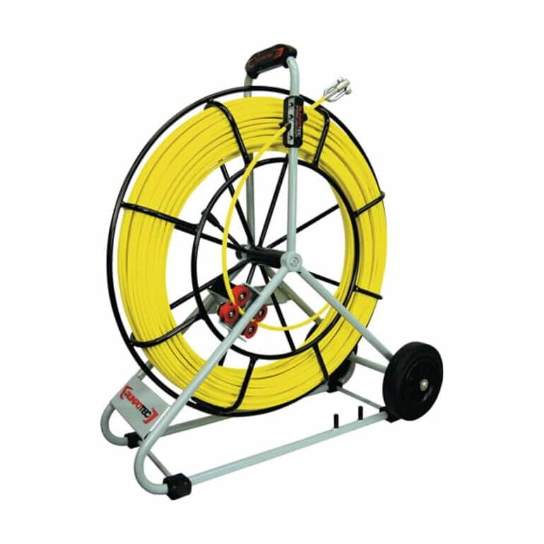 Kabeleinziehgerät Glasfaserstab Ø 9,0 mm · optimal geeignet für Rohrdurchmesser für 60-200 mm · RUNPOTEC Gewinde RTG Ø 12 mm mit robuster Stahlhaspel (KTL-/pulverbeschichtet) Ø 730 mm inkl. neuem Doppel-Auslaufsystem (automatische Auslaufbremse und Schnellauslauf), integrierter Meterzähler, zusätzliche Feststellbremse · Schäckel verfügt zusätzlich über ein Übergangsgewinde auf RTG Ø 6 mm um diverse Führungsstäbe (RUNPOSTICK), Führungssonden, Kabelziehstrümpfe, schraubbare Inspektionskamera und dgl. zu adaptieren · Glasfaserstab-Zuglast 4500 kg Weitere technische Eigenschaften: · Zugbelastung: 460kg · Biegeradius: 620mm · Gewicht: 19,9kg · Kabel-Ø: 9mm