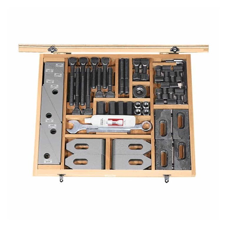 • Bestehend aus verschiedenen Spann-Elementen, die zum schnellen Aufspannen von Werkzeugen, Vorrichtungen oder Werkstücken auf T-Nutentischen benötigt werden
