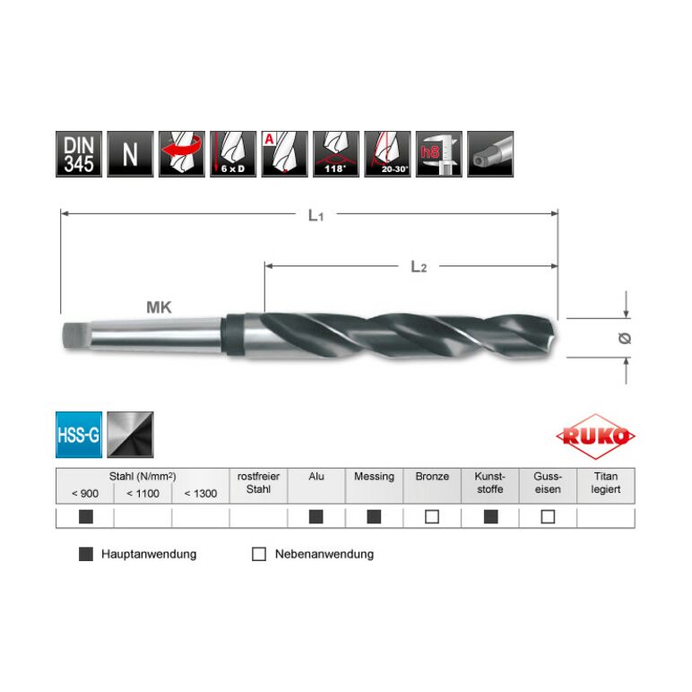 Eigenschaften:Ø 16,0 x 218 x 120 mmLeistungsstarker Standardbohrer mit MorsekegelZum Bohren von Stahl, Stahlguss und Gusseisen, legiert und unlegiertHohe BruchsicherheitHSS: Hochleistungs-Schnellarbeitsstahl für Bohrungen in gut bearbeitbare Materialien mit einer Festigkeit von bis zu 900 N/mm2Form A: Ausgespitzte QuerschneideAnwendung: Für alle üblichen Bohrarbeiten bei Bohrern mit starkem Kern, bei großen Bohrerdurchmessern zum Bohren ins volle MaterialVorteile: Gute Zentrierung beim Anbohren durch Verkürzung der Querschneidenlänge auf 1/10 des Bohrerdurchmessers und Verringerung der VorschubkraftNachteile: Zusätzliche Schleifarbeit
