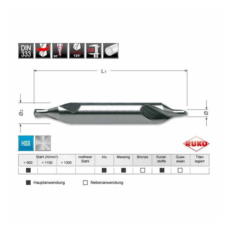 EigenschaftenZum Herstellen von Zentrierbohrungen nach DIN 332 Form A, B, CHSS: Hochleistungs-Schnellarbeitsstahl für Bohrungen in gut bearbeitbare Materialien mit einer Festigkeit von bis zu 900 N/mm².