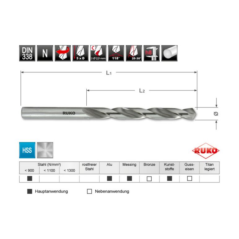 EigenschaftenLeistungsstarker, geschliffener Spiralbohrer aus Hochleistungs-SchnellarbeitsstahlDer komplett geschliffene Spiralbohrer verfügt über eine erhöhte RundlaufgenauigkeitEinsatzgebiete: für Stahl, Stahlguß legiert und unlegiert (bis 900 N/mm² Festigkeit), Grau-, Temper-, Sphäro- und Druckguß, Sintereisen, Neusilber, Graphit, kurz­spanende Aluminiumlegierungen, Messing und Bronze.