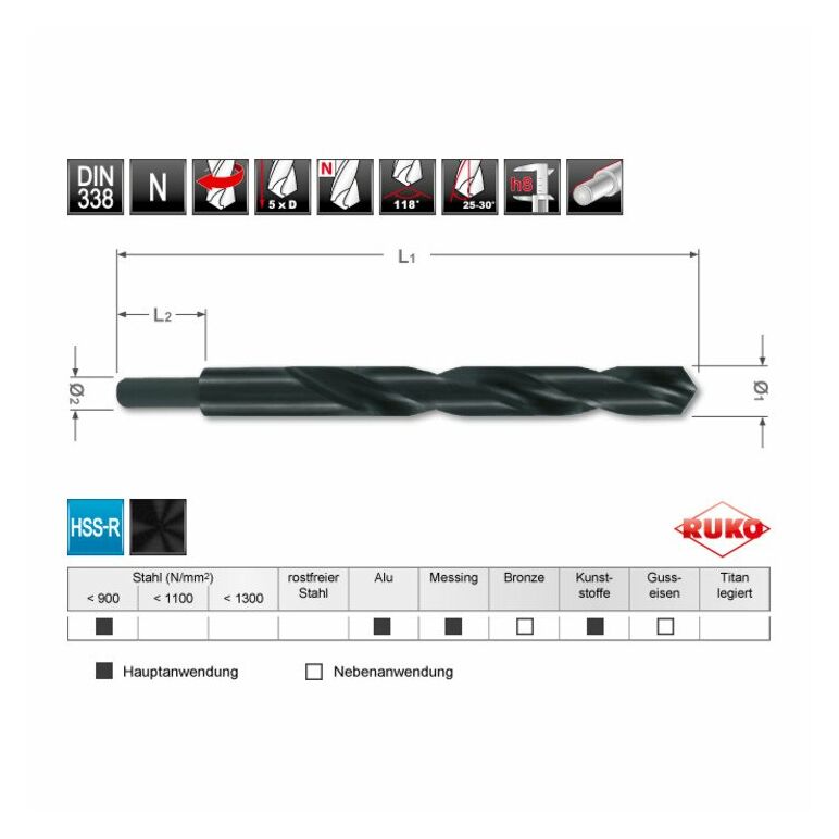 RUKO Spiralbohrer DIN 338 HSS-R Typ N mit abgesetztem Schaft D 25,0 mm L 205 mm