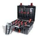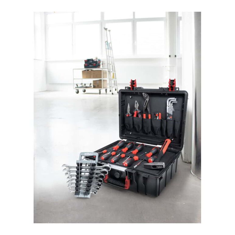 Eigenschaften:Im mobilen Einsatz ist es nicht leicht alle nötigen Werkzeuge bei sich zu tragen und gleichzeitig Ordnung zu bewahrenMit dem Werkzeugkoffer Basic hat der mobile Mechaniker eine überzeugende Ausstattung und verliert dabei nicht die ÜbersichtFür die optimale Grundausstattung ist der handliche Werkzeugkoffer mit einem Sortiment aus hochwertigen Handwerkzeugen bestücktVon ergonomischen Schraubendrehern, über eine Auwahl an Zangen bis hin zu einem Ringratschen-Gabelschlüssel Set hat der Anwender für jede Arbeitssituation das passende Werkzeug zur HandDarüber hinaus bietet der Koffer dank weiterer Schlaufen und zusätzlichem Stauraum reichlich Platz für die weitere, individuelle ZusatzausrüstungDer aus Polypropylen hergestellte Koffer garantiert Robustheit und kann dank der integrierten Ösen mit Vorhängeschlössern gegen Diebstahl gesichert werden (diese sind nicht im Lieferumfang enthalten)Für das angenehme Tragegefühl sorgt der ergonomische ZweikomponentengriffAuch für Flüge ist der Werkzeugkoffer Basic dank Luftdruckausgleichsventil bestens geeignet und kann mit vorhandenem, selbst beschriftbarem Namensschild eindeutig dem Eigentümer zugeordnet werdenZertifiziert nach der Schutzklasse IP 67 ist der Werkzeugkoffer von Wiha staub- und wasserdichtMit seinen 20 l Fassungsvolumen und einer zulässigen Tragfähigkeit von bis zu 14,2 kg ist er für verschiedenste Einsatzbedingungen gewappnetLieferumfang:1x Schraubendreher SoftFinish® Schlitz mit Rundklinge für tiefliegende Schrauben 3,0 mm x 100 mm (00687)1x Schraubendreher SoftFinish® Schlitz mit durchgehender Sechskantklinge und massiver Stahlkappe 5,5 mm x 100 mm (03225)1x Schraubendreher SoftFinish® Phillips mit Rundklinge PH1 x 80 mm (00756)1x Schraubendreher SoftFinish® Phillips mit Rundklinge PH2 x 100 mm (00759)1x Schraubendreher SoftFinish® TORX® mit Rundklinge T15 x 80 mm (01291)1x Schraubendreher SoftFinish® TORX® mit Rundklinge T20 x 100 mm (01292)1x Schraubendreher SoftFinish® TORX® mit Rundklinge T25 x 100 mm (01293)1x Schraubendreher mit Bithalter magnetisch Stubby, 1/4" 57 mm (29463)1x Schraubendreher mit Bithalter SoftFinish® magnetisch 1/4" 125 mm (01475)1x Stiftschlüssel Set im Compact Halter Sechskant-Kugelkopf 10-tlg. mattverchromt (01418)1x Kombizange Industrial mit DynamicJoint® und OptiGrip mit extra langer Schneide 180 mm, 7" (30826)1x Flachrundzange Industrial mit Schneide gerade Form 160 mm, 6 1/2" (32322)1x Wasserpumpenzange Classic durchgesteckt 250 mm (26761)1x Bit Set FlipSelector Standard 25 mm gemischt 14-tlg. 1/4" C6,3 (39078)1x Schlosserhammer I 0-845 Locksmith Hammer 300g1x Ringratschen-Gabelschlüssel Set 8-tlg. inkl. Halter (44664)1x Koffer