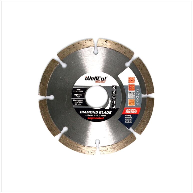 Die hochwertige WellCut Diamant Trennscheibe 223-115/22 überzeugt mit einer langen Lebensdauer und besonders hoher Leistung. Sie ist für präzise Arbeiten und für den allgemeinen Gebrauch geeignet und kann für Baumaterialien und Beton genutzt werden.