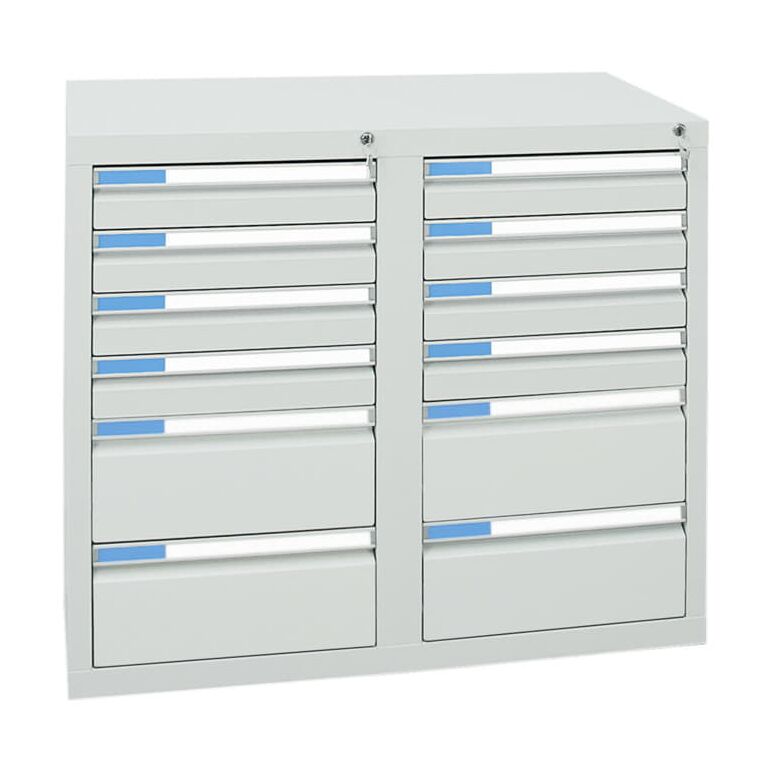 - Mit 12 Schubladen auf Teleskopführungen (100 %-Auszug)