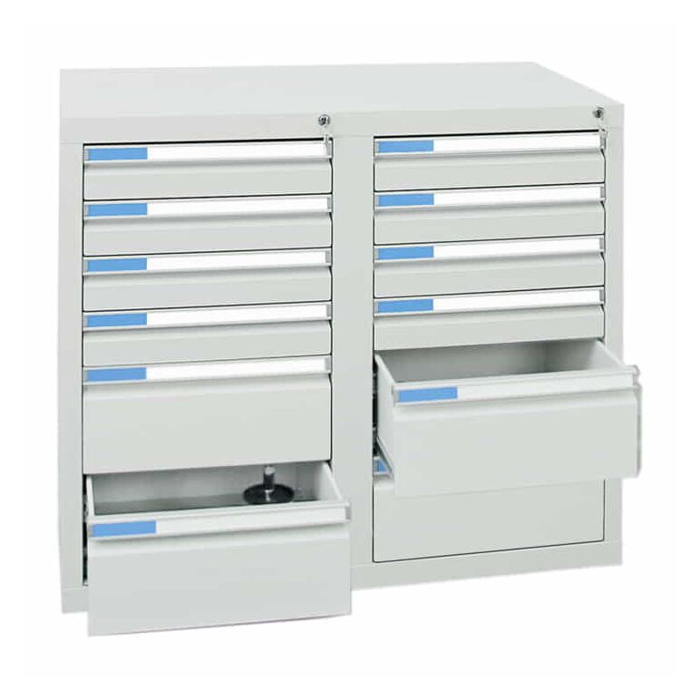 - Farbgebung Korpus: lichtgrau RAL 7035, Farbgebung Schubladen: lichtgrau RAL 7035