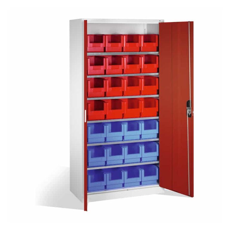 - 1x C+P Magazinschrank mit 28 Sichtlagerkästen, H1980xB1000xT420mm Front Rubinrot Korpus Lichtgrau
