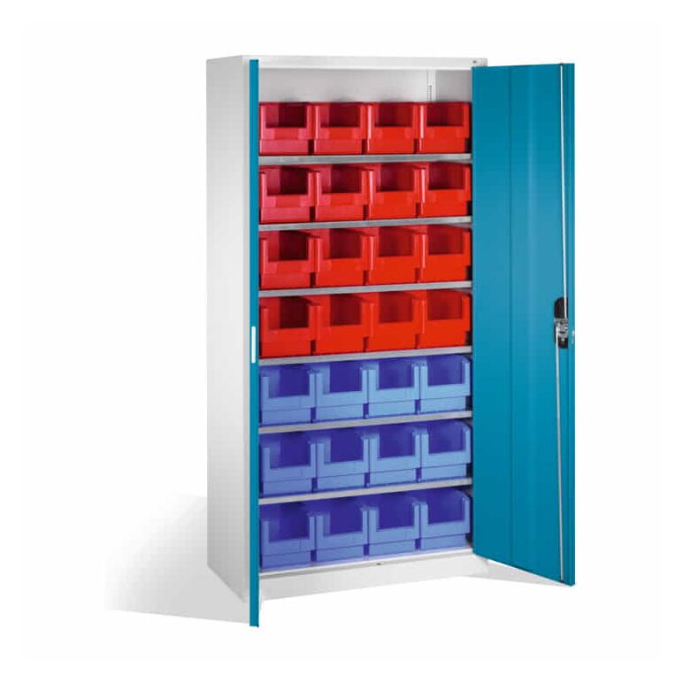 - 1x C+P Magazinschrank mit 28 Sichtlagerkästen, H1980xB1000xT420mm Front Lichtblau Korpus Lichtgrau