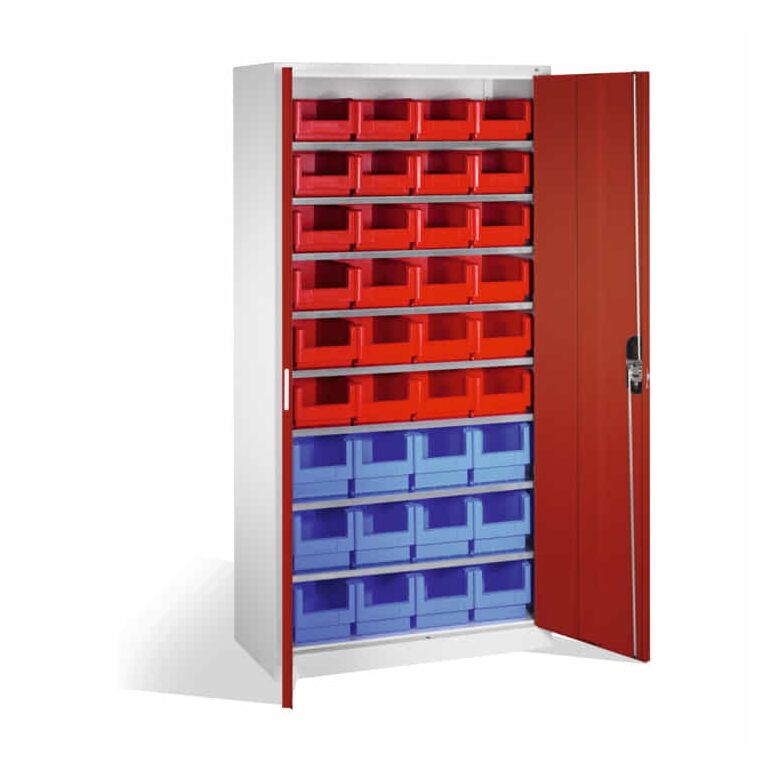 - 1x C+P Magazinschrank mit 26 Sichtlagerkästen, H1980xB1000xT420mm Front Rubinrot Korpus Lichtgrau