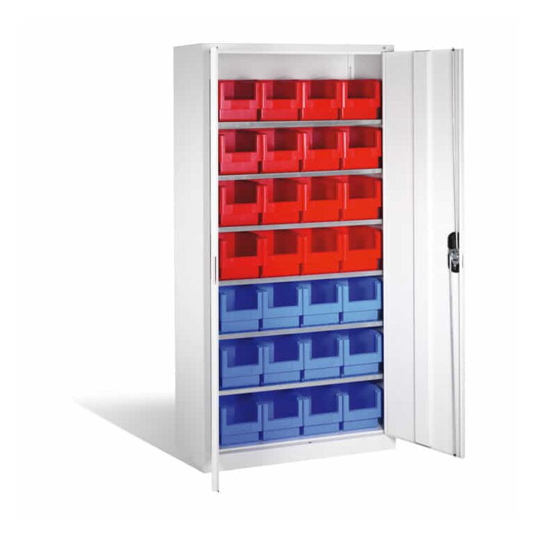 - 1x C+P Magazinschrank mit 28 Sichtlagerkästen, H1980xB1000xT420mm Front Lichtgrau Korpus Lichtgrau