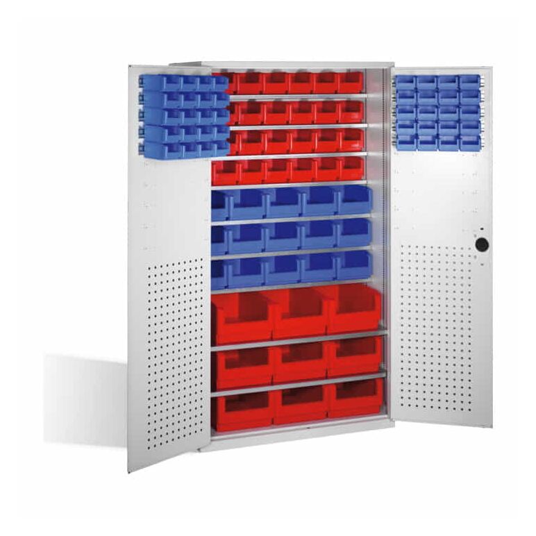 - 1x C+P Magazinschrank mit 92 Sichtlagerkästen, H1950xB1100xT535mm Front Lichtgrau Korpus Lichtgrau