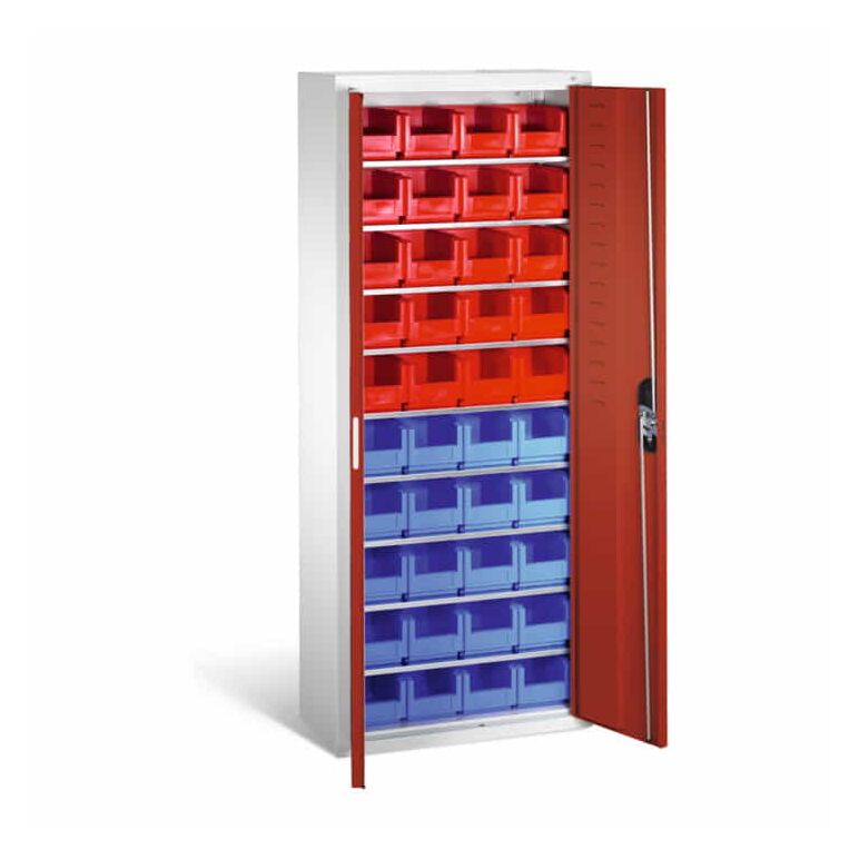 - 1x C+P Magazinschrank mit 40 Sichtlagerkästen, H1690xB700xT300mm Front Rubinrot Korpus Lichtgrau