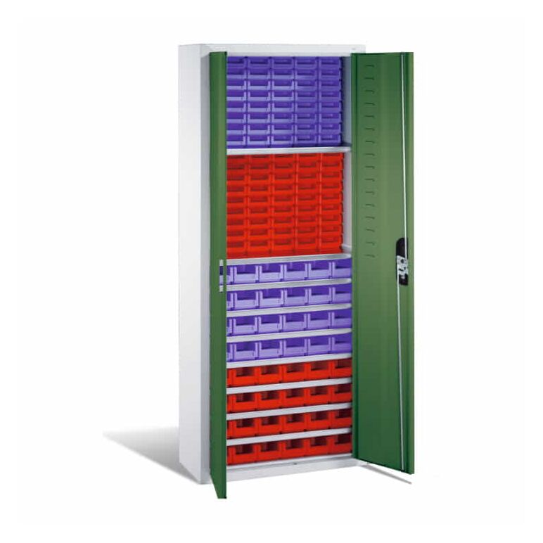 - 1x C+P Magazinschrank mit 138 Sichtlagerkästen, H1690xB700xT300mm Front Resedagrün Korpus Lichtgrau