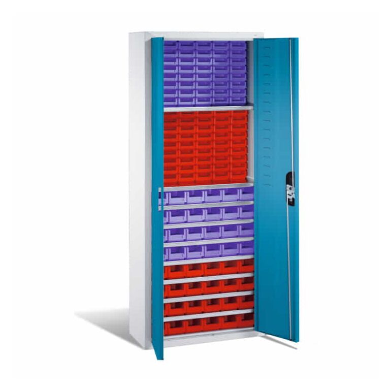- 1x C+P Magazinschrank mit 138 Sichtlagerkästen, H1690xB700xT300mm Front Lichtblau Korpus Lichtgrau
