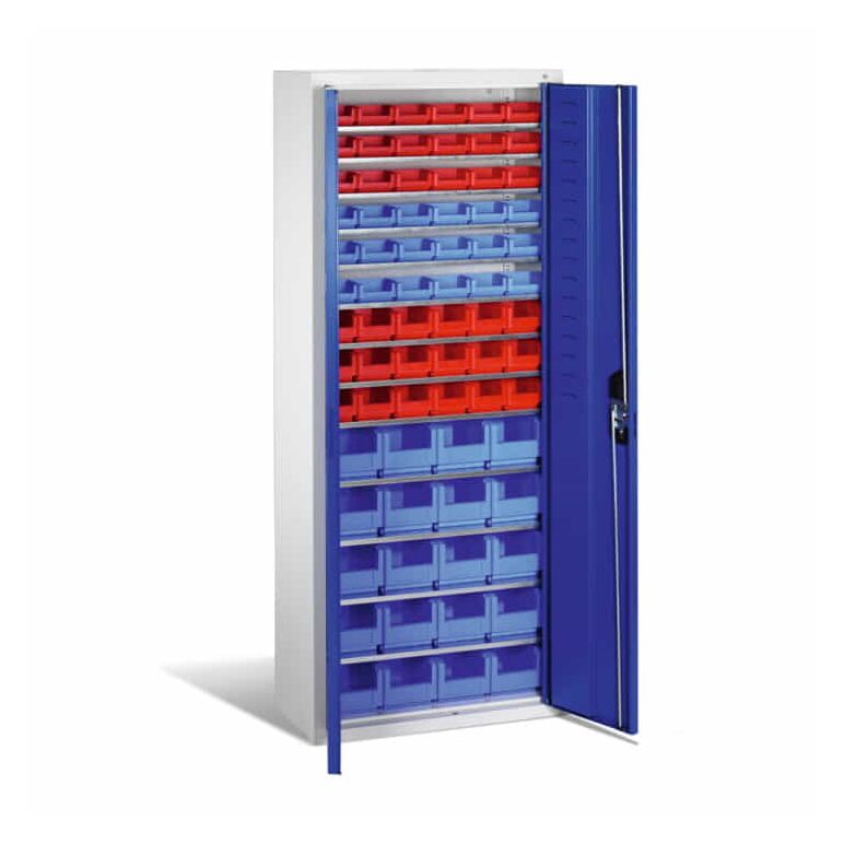 - 1x C+P Magazinschrank mit 74 Sichtlagerkästen, H1690xB700xT300mm Front Enzianblau Korpus Lichtgrau