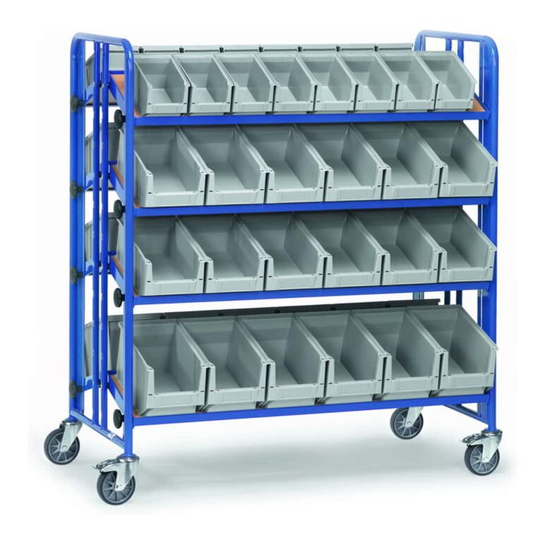 Eigenschaften:Die Fetra MultiVario Transporter basieren auf einem praktischen Baukasten-System mit dem fetra Steck- und SchraubprinzipDurch die einzigartige Zweipunkt-Lagerung sorgt das fetra Steck- und Schraubpinzip für eine dauerhafte und spielfreie Verbindung mit der Stabilität einer SchweißkonstuktionDies gewährleistet eine sichere und gleichzeitig flexibel veränder- und austauschbare Verbindung von Rahmen und AufbautenStahlrohr- und Profilstahlgeschweißt, pulverbeschichtet blau RAL 5007, Schraubkonstruktion4 zweiteilige Etagen mit Holzwerkstoffplatten, Rand 12 mm hoch und 16 Sichtlagerkästen LxBxH 230/200 x 147 x 132 mm, 24 Stück 350/300 x 210 x 145 mm und 12 Stück 350/300 x 210 x 200 mmVariabel einschraubbare EtagenEinschraubraster 100 mm, Neigung stufenlos einstellbar von 0° bis 35°, sichere Arretierung mittels GriffschraubenDeutsches Patent: 10 2005 062 391. Tragkraft pro Ladefläche 60 kg4 Lenkrollen, TPE-Bereifung, Naben mit Rillenkugellager2 Stück mit Feststeller, gemäß EN 1757-3 (Sicherheit von Plattformwagen).Ein Produktvideo zum Fetra Baukastensystem finden Sie hier: Fetra Baukastensystem