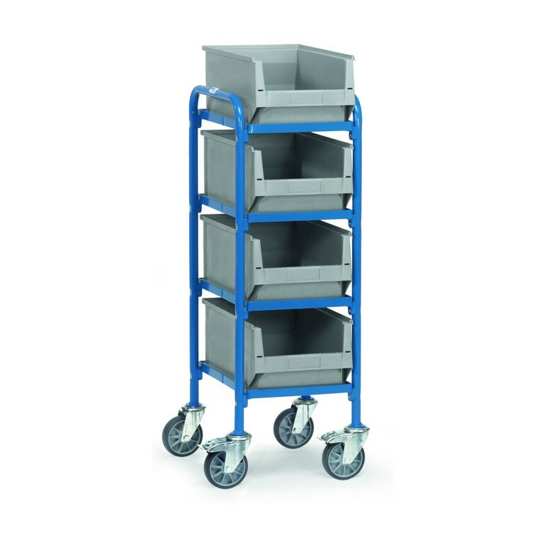Eigenschaften:Die Fetra MultiVario Transporter basieren auf einem praktischen Baukasten-System mit dem fetra Steck- und SchraubprinzipDurch die einzigartige Zweipunkt-Lagerung sorgt das fetra Steck- und Schraubpinzip für eine dauerhafte und spielfreie Verbindung mit der Stabilität einer SchweißkonstuktionDies gewährleistet eine sichere und gleichzeitig flexibel veränder- und austauschbare Verbindung von Rahmen und AufbautenStahlrohr- und Profilstahl geschweißt, pulverbeschichtet blau RAL 5007, Schraubkonstruktion4 Etagen mit Holzwerkstoffplatten, Rand 12 mm hoch und 16 Sichtlagerkästen (LxBxH: 500/450 x 310 x 200 mm)Tragkraft pro Ladefläche 60 kg4 Lenkrollen, TPE-Bereifung, Naben mit Rillenkugellager2 Stück mit Feststeller, gemäß der Europäischen Norm EN 1757-3 (Sicherheit von Plattformwagen)Zerlegte Anlieferung.Ein Produktvideo zum Fetra Baukastensystem finden Sie hier: Fetra Baukastensystem