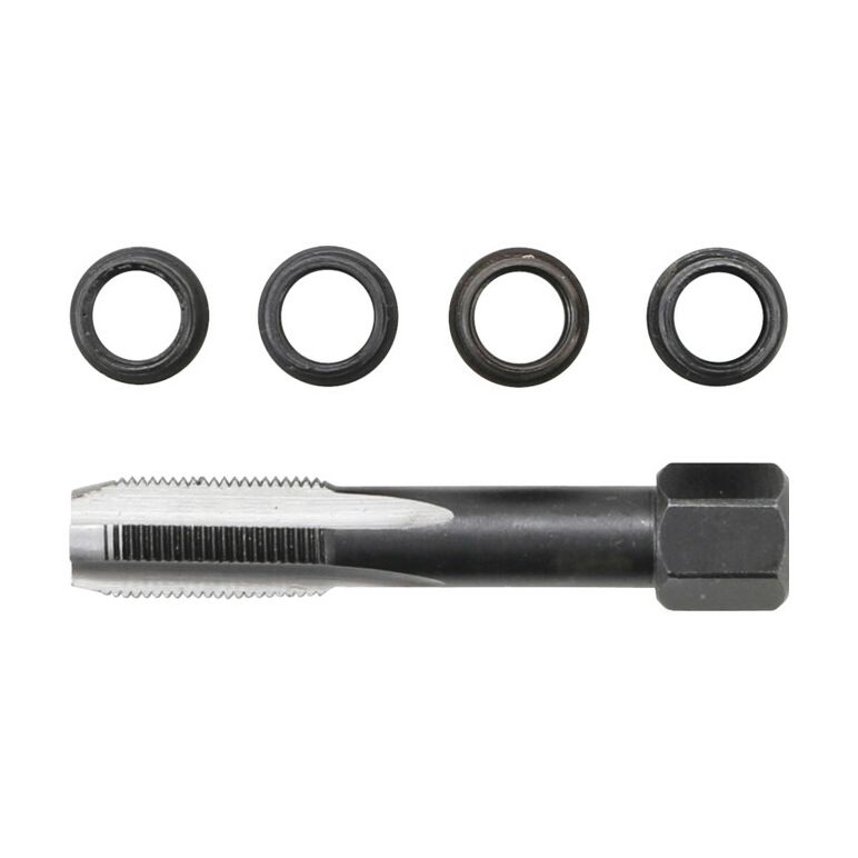 Eigenschaften:Geeignet für Reparatur von ZündkerzengewindenM12 x 1,0 HSS-Gewindeschneider, Länge 65 mm, Außensechskant-Antrieb SW 13 mm4 Gewindeeinsätze M10 x 1,0 in den Längen 9,5 - 11,5 - 12,7 - 19 mm