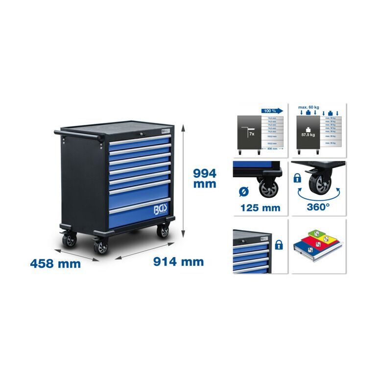 Eigenschaften:Hochwertige WerkstattausführungStabile StahlblechkonstruktionPulverbeschichteter Korpus, besonders resistent gegen KratzerExtra breite Ausführung für zusätzlichen Stauraum und mehr ArbeitsflächeMit seitlichem Fahrgriff zum leichten RangierenAbschließbar mittels ZentralschloßDurchgehende GriffleistenObere Platte mit Softschaum-Auflage, belastbar bis 60 kgHochbelastbare, kugelgelagerte Rollen, davon 2 feststellbare LenkrollenRollenbreite: 48 mmRollendurchmesser: 125 mmWandstärke Korpus: 0,9 - 1,0 mmWandstärke Schublade: 0,7 - 0,8 mm7 leichtgängige, kugelgelagerte Schubladen:1 bis 5. Schublade bis 30 kg belastbar (je Schublade)6 bis 7. Schublade bis 35 kg belastbar (je Schublade)Schubladenbreite (Innenmaß): 775 mmSchubladentiefe (Innenmaß): 403,6 mmSchubladenhöhe (Innenmaß): 5 x 59 mm | 2 x 138 mm