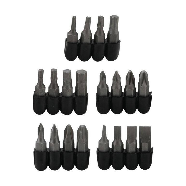 Lieferumfang:Bits, Schlitz 3 - 4,5 - 6 - 7 mmBits, Kreuzschlitz PH0 - PH1 - PH2 - PH3Bits, Kreuzschlitz PZ0 - PZ1 - PZ2 - PZ3Bits, T-Profil (für Torx) T10 - T15 - T20 - T30Bits, Innensechskant 3 - 4 - 5 - 6 mm