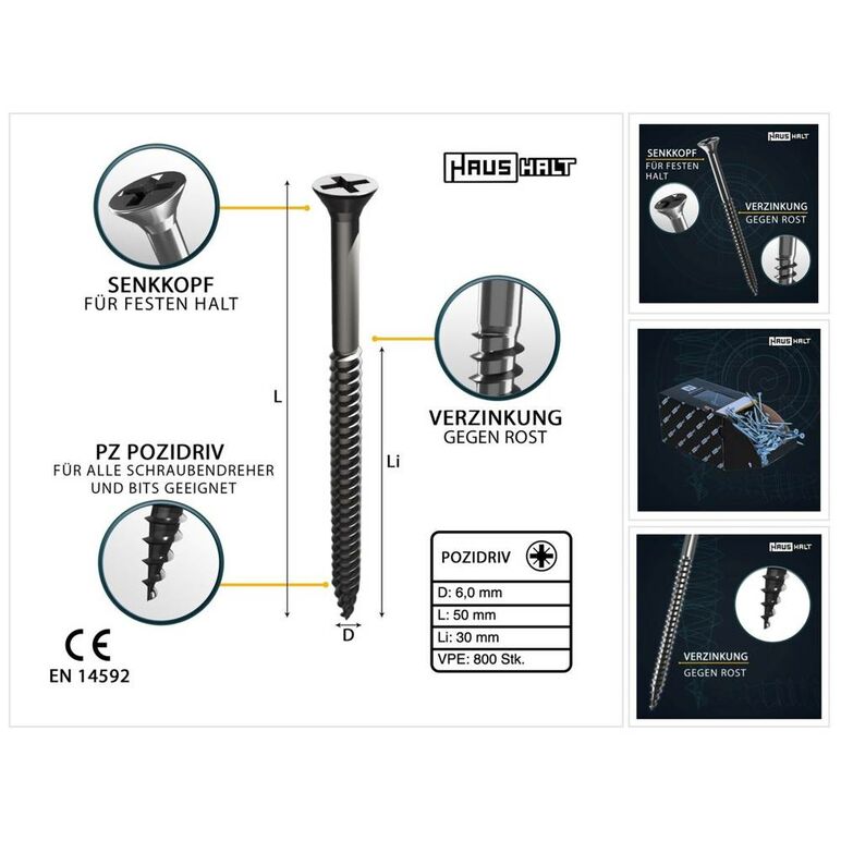 - 800x HausHalt Universal Holzbauschraube Holzschraube 6,0 x 50 mm PZ3