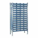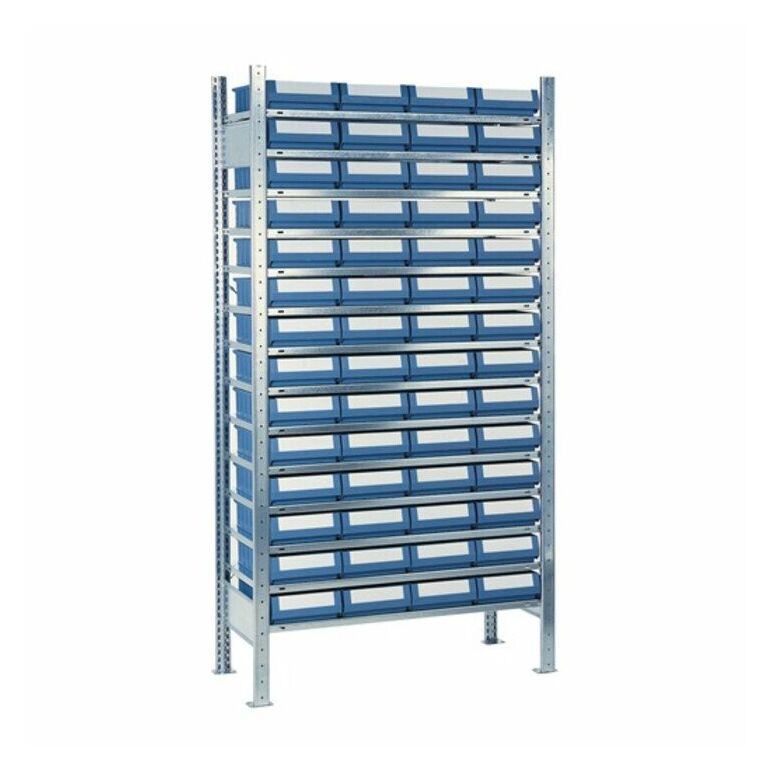 mit Regalkästen · einfache und schnelle Steckmontage mit vormontierten verzinkten Rahmen · Fachböden verzinkt mit verstärktem Kastenprofil, H 25 mm, höhenverstellbar im 25-mm-Raster · Tragfähigkeit pro Fachboden 150 kg · Feldlast 1300 kg Regalmaße: H 2000 x B 1000 x T 300/400/500 mm Regalaußenmaße: Grundregal + 60 mm, Anbauregal + 6 mm, Tiefe + 36 mm Weitere technische Eigenschaften: · Anzahl Regalkästen x Gr.: 56 x 5 · Ausstattung: Stahlböden · Feldlast: 1300kg
