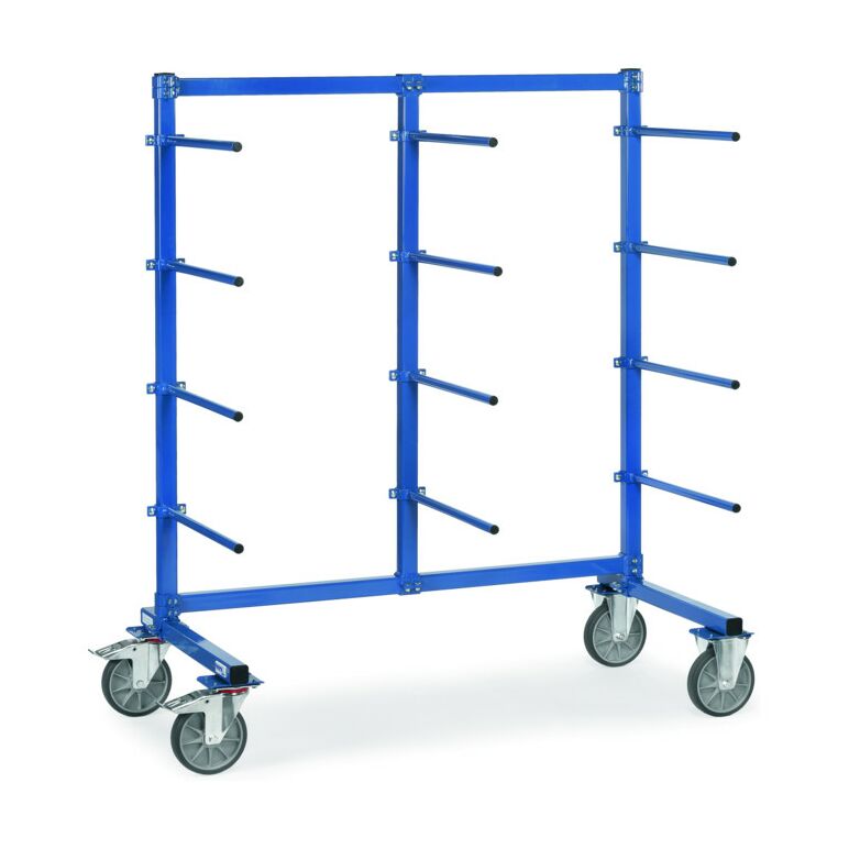 Pulverbeschichtet blau RAL 5007. 2 Lenk- und 2 Bockrollen, TPE-Bereifung, Naben mit Rillenkugellager
