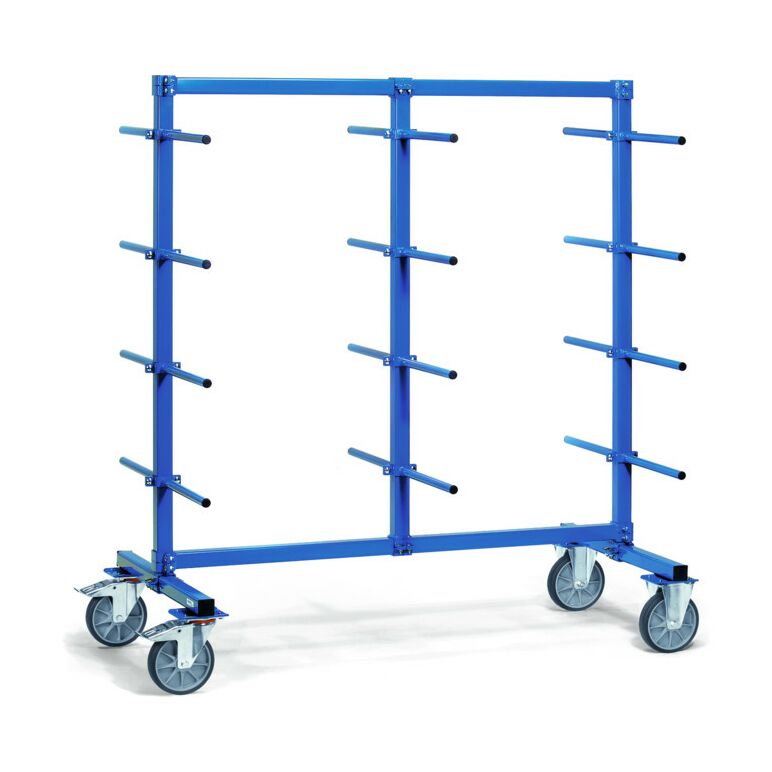Pulverbeschichtet blau RAL 5007. Tragkraft pro Etage 120 kg (60 kg/Seite).2 Lenk- und 2 Bockrollen, TPE-Bereifung, Naben mit Rillenkugellager
