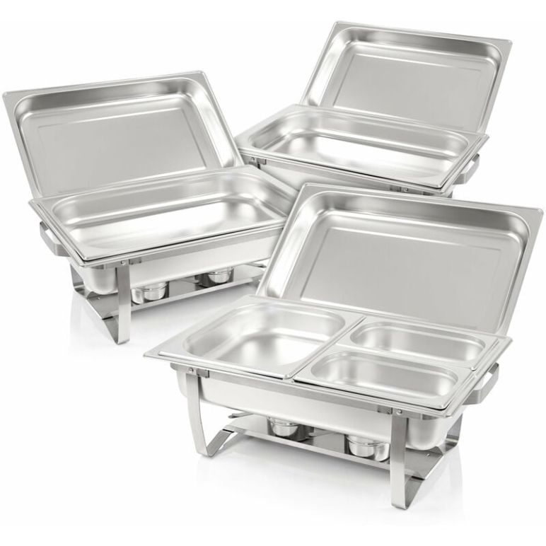 """ZELSIUS Chafing dish Profi Set """"Montpellier"""" Mit diesem Chafing dish Profi Set können Sie dank der hochwertigen Qualität ideal Ihre erwärmten oder kalten Speisen bereithalten. Das Set besteht aus drei Chafing dishes, gefüllt mit zwei 1/1 GN-Behälter, einem 1/2 GN-Behälter und zwei 1/4 GN-Behälter. Im Lieferumfang sind neben den Deckeln auch sechs Brennpastenbehälter. Das Chafing dish Profi Set eignet sich hervorragend für Feiern, Feste, Catering, Gastronomie und vieles mehr. Hinweis: Brennpaste ist nicht im Lieferumfang enthalten! Highlights 3x Chafing dish ideal für warme und kalte Speisen Material: Edelstahl Eignet sich hervorragend für Feiern, Feste, Catering, Gastronomie und mehr inkl. 2x GN-Behälter 1/1 (9 L) inkl. 1x GN-Behälter 1/2 (4 L) inkl. 2x GN-Behälter 1/4 (1,8 L) inkl. 3x Gestelle und 3x Deckel inkl. 3x Wasserbecken inkl. 6x Brennpastenbehälter inkl. 1x Haltestrebe Markenprodukt von Zelsius Details inkl. 1x 1/2 GN-Behälter und 2x 1/4 GN-Behälter inkl. 2x 1/1 GN-Behälter"""