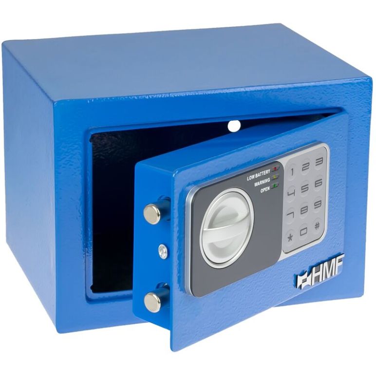 Der kleine HMF Möbeltresor mit elektronischem Zahlenschloss überzeugt mit einer Doppelbolzenverriegelung und individuell programmierbarem PIN-Code. Komptakter Tresor zur Aufbewahrung von Bargeld, Wertsachen und Dokumenten Geeignet für Hotels, Geschäfte, Restaurants, Bars oder für Zuhause Elektronisches Zahlenschloss mit frei wählbarem Zahlencode mit 3 bis 8 Stellen Zusätzliches manuelles Schlüsselsystem zur Notöffnung mit zwei Schlüsseln Solider einwandiger Korpus aus Stahl Stahltür mit Doppelbolzenverriegelung Türanschlag rechts mit verdeckten Scharnieren Löcher zur Befestigung an Wand oder Boden Kratzfeste Pulverbeschichtung in Blau Bodeneinlage aus Fließstoff Passend für Dokumente im DIN A5 Format Abmessungen (B x H x T): Außen: 23 x 17 x 17 cm | Tiefe inkl. Bedienfeld / Drehgriff: ca. 18 cm Innen: 22,5 x 16,5 x 16,5 cm Türöffnung (B x H): 16 x 12 cm Wandstärke Korpus: 2 mm Türstärke: 4 mm Gewicht: 2,55 kg Lieferumfang: 1 x Tresor 2 x Notschlüssel 4 x AA Batterien 2 x Metalldübel 2