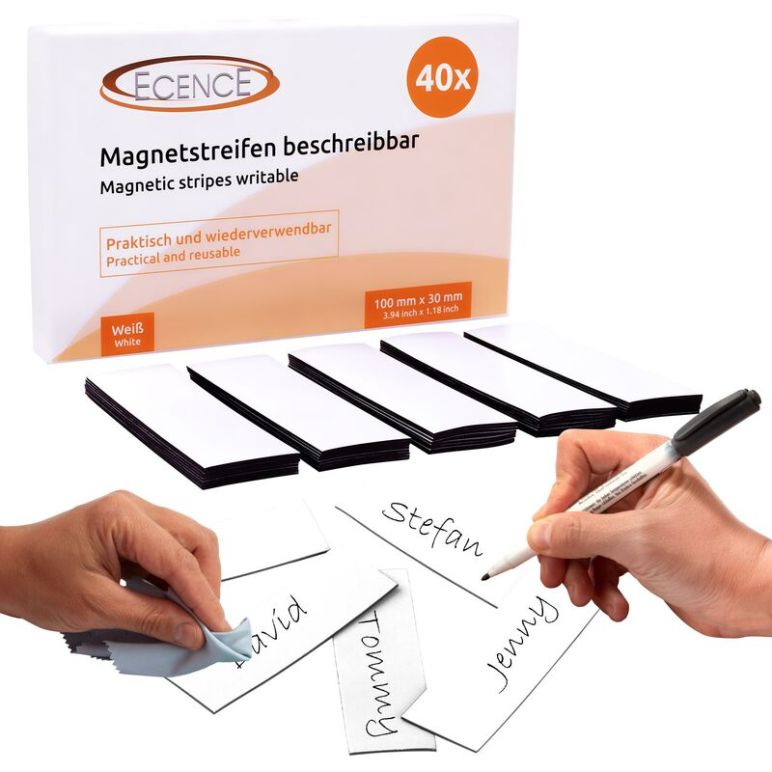 Ecence - 40 Magnetstreifen beschreibbar Etiketten Magnete Schilder Weiss