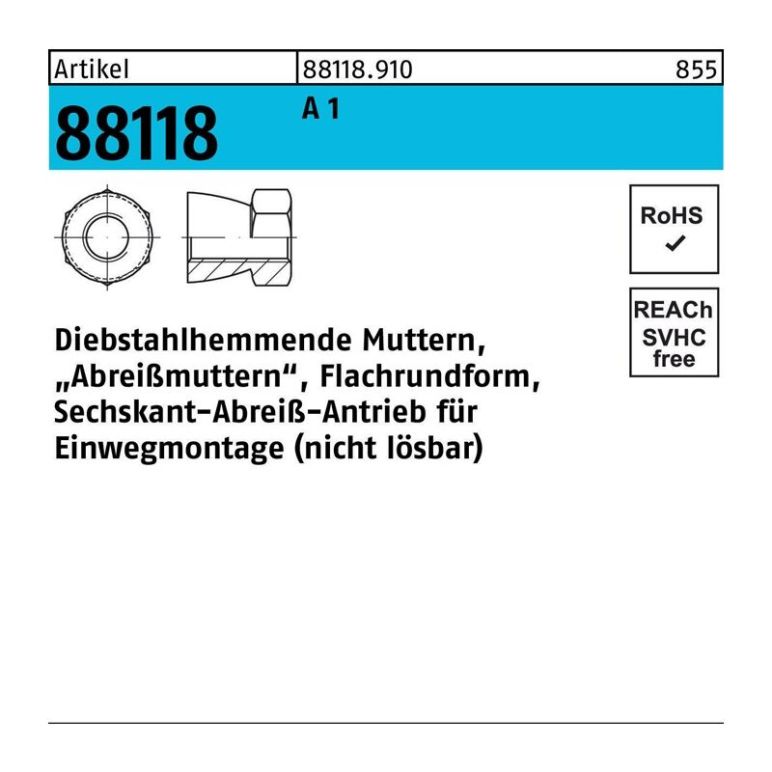 Mutter R 88118 diebstahlhemmend M16x 14 A 1 100 StückArtikel 88118 A 1 Diebstahlhemmende Muttern · Abreißmuttern - Abmessung: M 16 x 14 VE=S (100 Stück) Weitere technische Eigenschaften: · Gruppencode: 88118.910