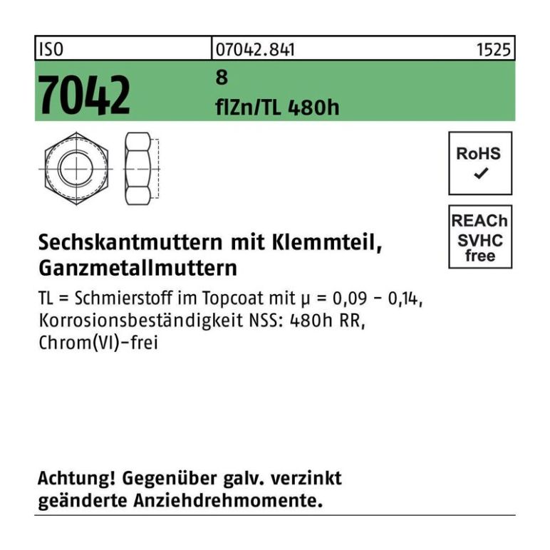 Sechskantmutter ISO 7042 Klemmteil M10 8 zinklamellenbes. flZnnc 480h-L 500St.ISO 7042 8 flZn/TL 480h (zinklamellenbesch.) Sechskantmuttern mit Klemmteil · Ganzmetallmuttern - Abmessung: M 10 VE=S (500 Stück) Weitere technische Eigenschaften: · Gruppencode: 07042.841