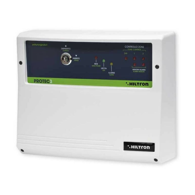"""Hiltron PROTEC3 Einbruchmeldezentrale mit den folgenden Merkmalen: Nominale Versorgungsspannung230V~ ±5% 50Hz Die Nennausgangsspannung beträgt 12Vdc ±10%. Normale Absorption 40mA Maximale Absorption 50mA Maximale Absorption des Steuergeräts allein 35mA Maximaler Strom, den das Netzteil liefern kann 1A Maximal lieferbarer Strom im Sirenenausgang 3A (mit angeschlossener Batterie) Maximal zulässiger Strom am Dienstausgang 440mA Inklusive Netzteil / Batterieladegerät 12V 7.5Ah Pufferbatterie (nicht enthalten) Merkmale: Baureihe Hiltron Unmittelbare Schutzzonen 1 Verzögerte Schutzzonen 1 24h""""-Schutzzonen 1 Einstellbare Alarmdauer 180 ÷ 600sec Schutzart des Behälters IP30 Sicherung am Transformator primär250mA L 250V Typ F Sicherung auf der Sekundärseite des Transformators1A Typ F - C 3,15A L 250V Typ F Ausgangssicherung der Service-Stromversorgung1A Typ F Einstellbare Ausgangszeit 4 bis 75 Sekunden Einstellbare Eingangszeit 4 ÷ 75sec ABS-Außenbehälter Betriebstemperatur +5°C bis +40°C"""