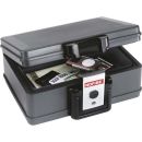 Überblick Widerstandsfähig bis 840° C - mindestens 30 Minuten Wasserdicht auch bei komplettem Eintauchen Sichere Medienaufbewahrung Beschreibung Die NOFIRE 2013FE Dokumentenbox, baugleich mit der First Alert Dokumentenbox 2013FE, schützt Dokumente und Wertgegenstände zuverlässig gegen Feuer und Wasser. Sie ist bei einer Temperatur bis zu 840° C mindestens 30 Minuten lang widerstandsfähig, somit sind Wertgegenstände im Brandfall sicher gelagert. Auch Wasser kann der Dokumentenbox nichts anhaben, denn selbst bei komplettem Eintauchen bleibt sie wasserdicht. Die Dokumentenbox umfasst einen Inhalt von 4,9 Litern und ist sicher mit einem Klammerverschluss verschlossen. Zu dem Klammerverschluss gehören 2 Schlüssel, mit denen sich die Box abschließen lässt. Ein praktischer Tragegriff ermöglicht einen komfortablen Transport. Bitte durch regelmäßiges Öffnen der Box eine ausreichende Belüftung schaffen, um einer erhöhten Luftfeuchtigkeit im luftdichten Innenraum vorzubeugen Eigenschaften