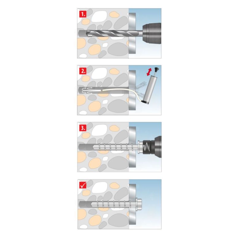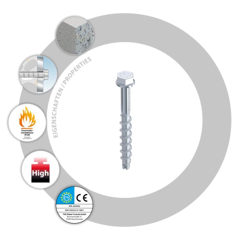 Die TOX Sumo Max 1 KB Schraubanker aus verzinktem Stahl für schwere Lasten eignen sich ideal zum Befestigen von Geländern, Metallkonsolen und Regalsystemen. Die TOX Sumo Max 1 KB Betonschrauben sind für verschiedene Klemmstärken zugelassen und in verschiedenen Größen erhältlich.