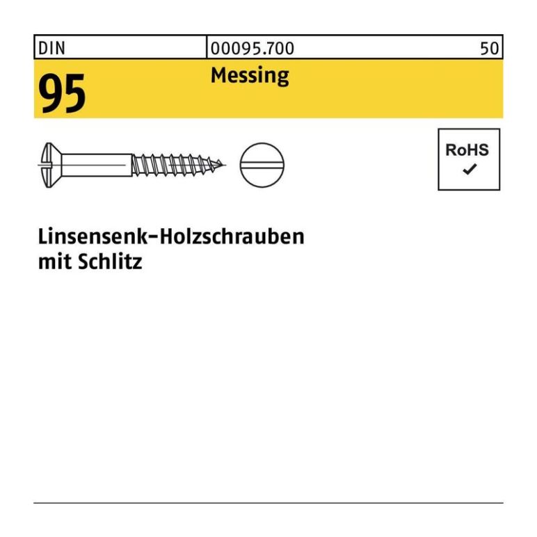 Holzschraube DIN 95 LIKO Schlitz 5x 30 Messing 200 StückDIN 95 Messing Linsensenk-Holzschrauben mit Schlitz - Abmessung: 5 x 30 VE=S (200 Stück) Weitere technische Eigenschaften: · Material: Messing · Form: Ohne Formfangabe · Gruppencode: 00095.700 · Norm: DIN 95