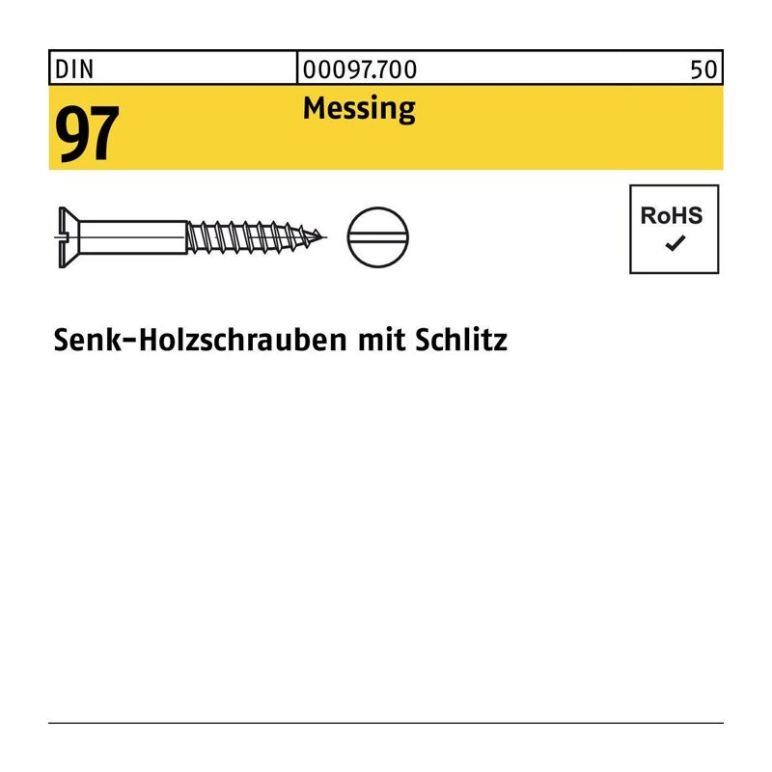 Holzschraube DIN 97 SEKO Schlitz 5x 40 Messing 200 StückDIN 97 Messing Senk-Holzschrauben mit Schlitz - Abmessung: 5 x 40 VE=S (200 Stück) Weitere technische Eigenschaften: · Material: Messing · Form: Ohne Formfangabe · Gruppencode: 00097.700 · Norm: DIN 97