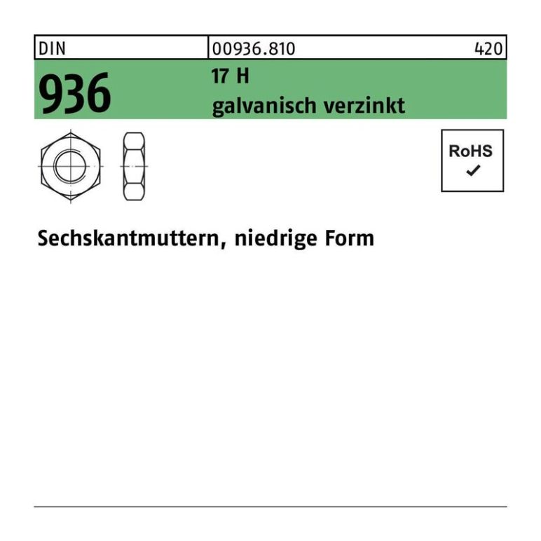 Sechskantmutter DIN 936 M8 17 H galv.verz. 1000 StückDIN 936 17 H galvanisch verzinkt Sechskantmuttern · niedrige Form - Abmessung: M 8 VE=S (1000 Stück) Weitere technische Eigenschaften: · Gruppencode: 00936.810